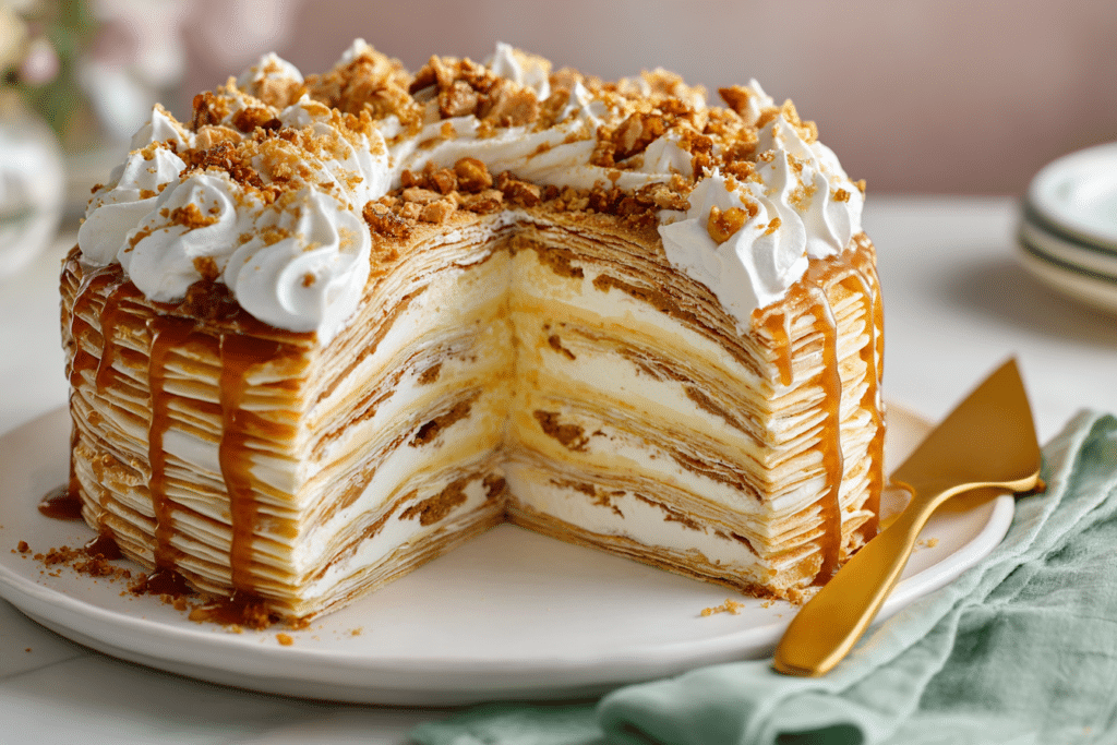 If you’re looking for a show-stopping dessert that combines elegance with comfort, this Vanilla & Speculoos Crêpe Cake is your answer. With soft, delicate crêpes stacked high and layered with …