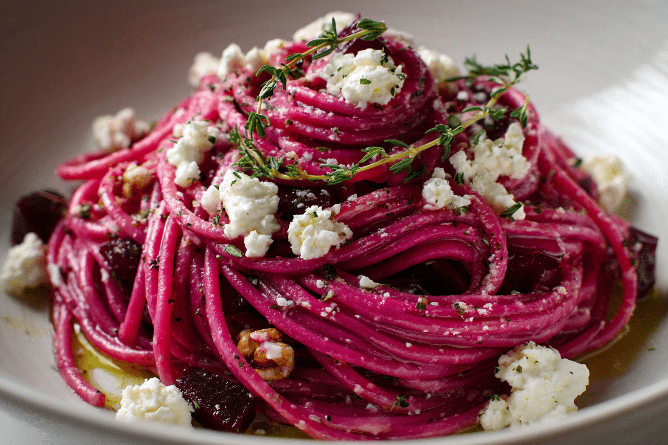 Beet and Goat Cheese Pasta is a striking and flavorful dish that blends earthy roasted beets with creamy goat cheese for a smooth, rich sauce. The natural sweetness of the beets pairs beautifully with the tangy cheese, creating a balanced and satisfying meal that feels both comforting and fresh.