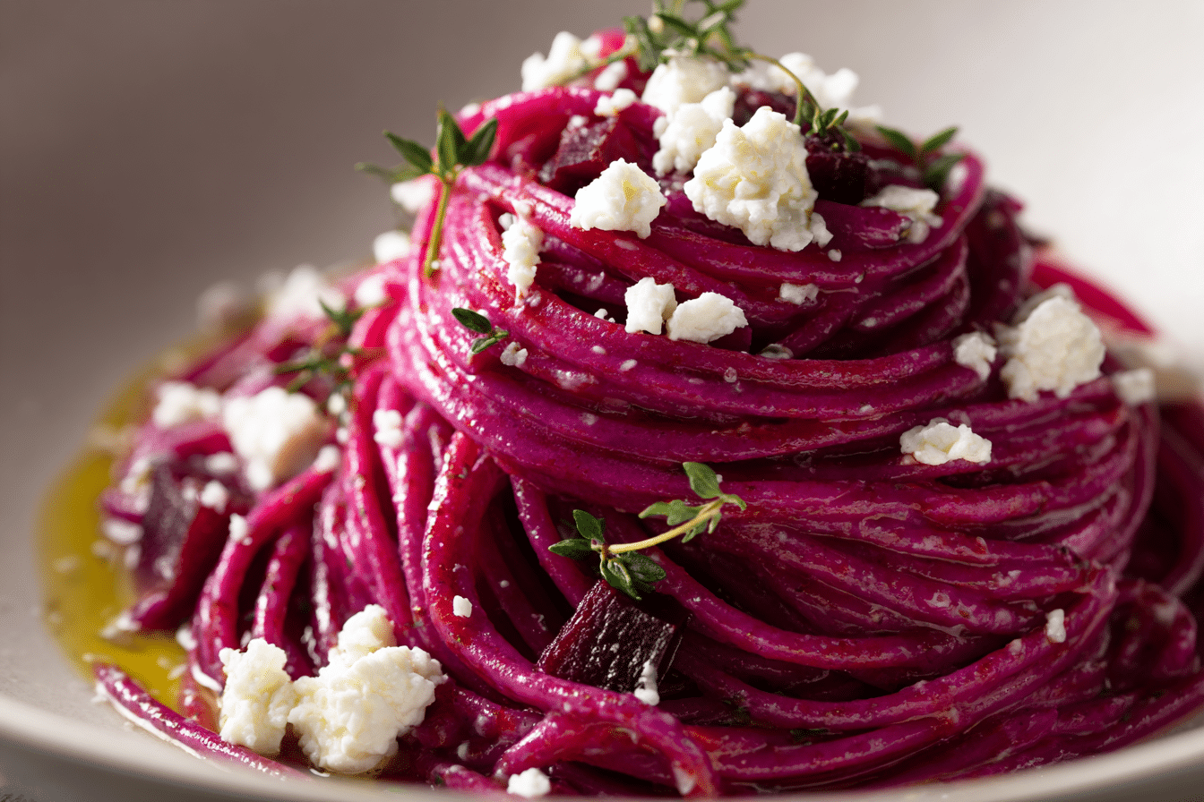 A creamy and vibrant pasta dish made with roasted beets and tangy goat cheese for a rich and balanced flavor.