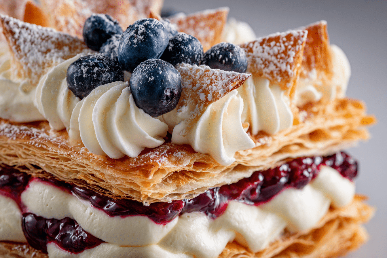 Yes, but only partially. You can bake the puff pastry and whip the cream in advance. However, it’s best to assemble the cake just before serving or within 1–2 hours to keep the pastry from going soggy.