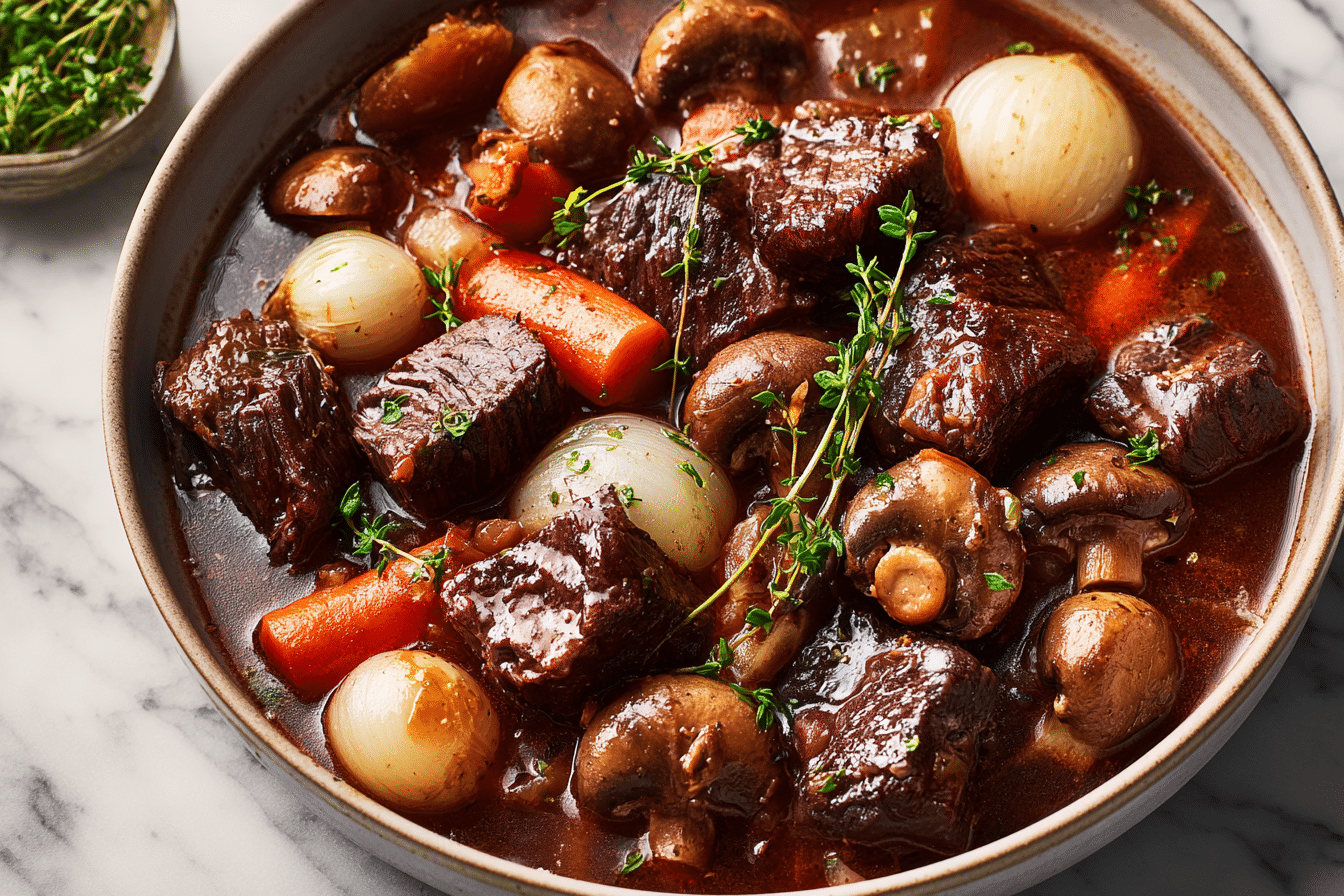 A classic French beef stew slow-cooked in red wine with vegetables and rich flavor.
