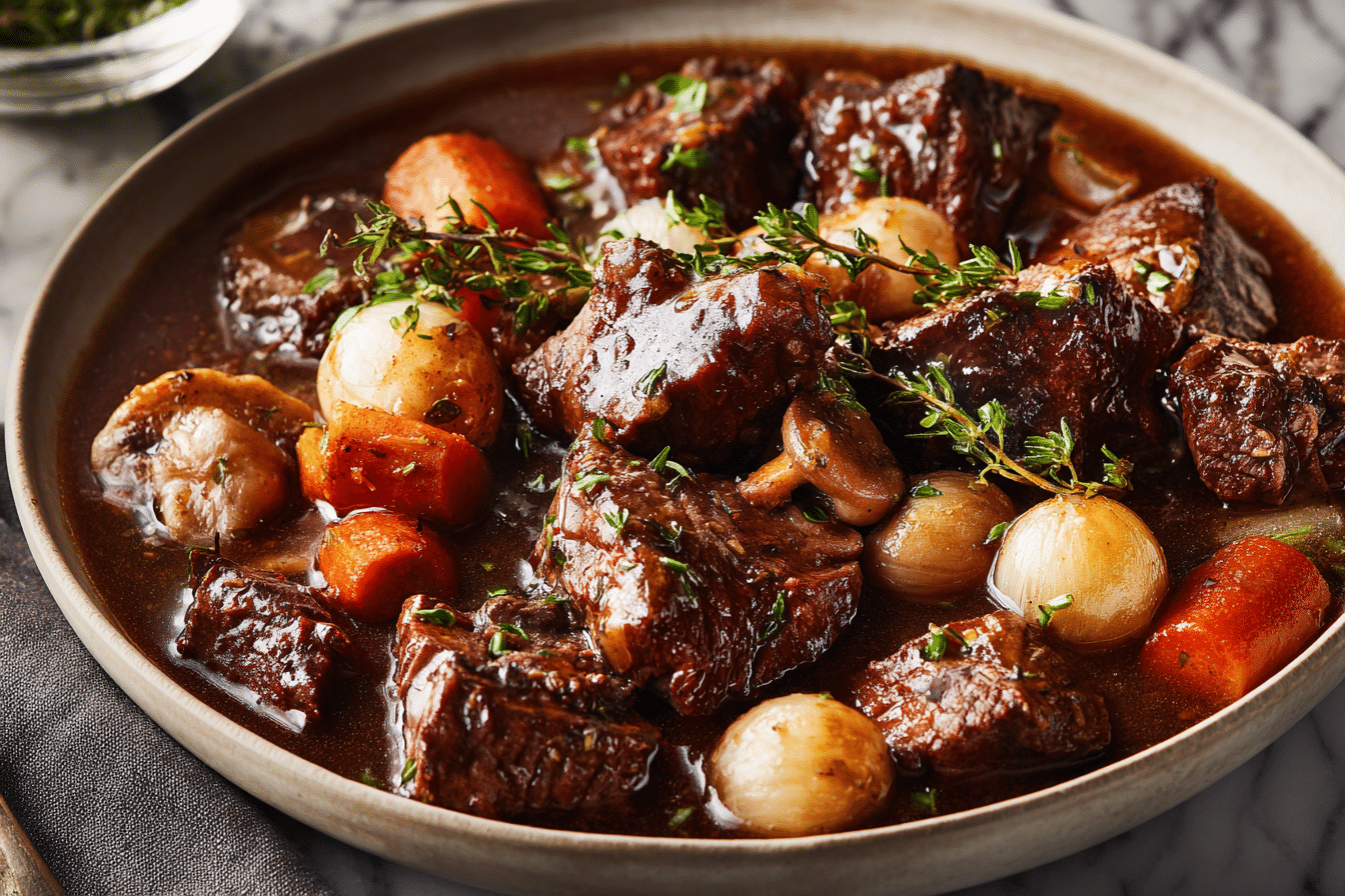 A classic French beef stew slow-cooked in red wine with vegetables and rich flavor.