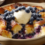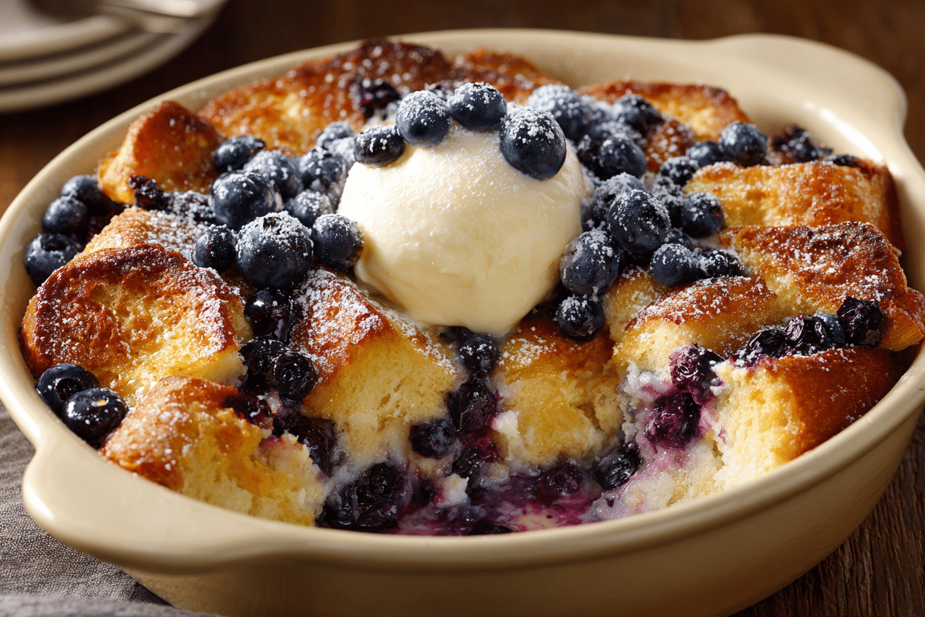 This Blueberry French Toast Casserole features layers of buttery bread, juicy blueberries, and warm vanilla custard, all baked with a golden crumb topping. Make ahead for effortless brunches!