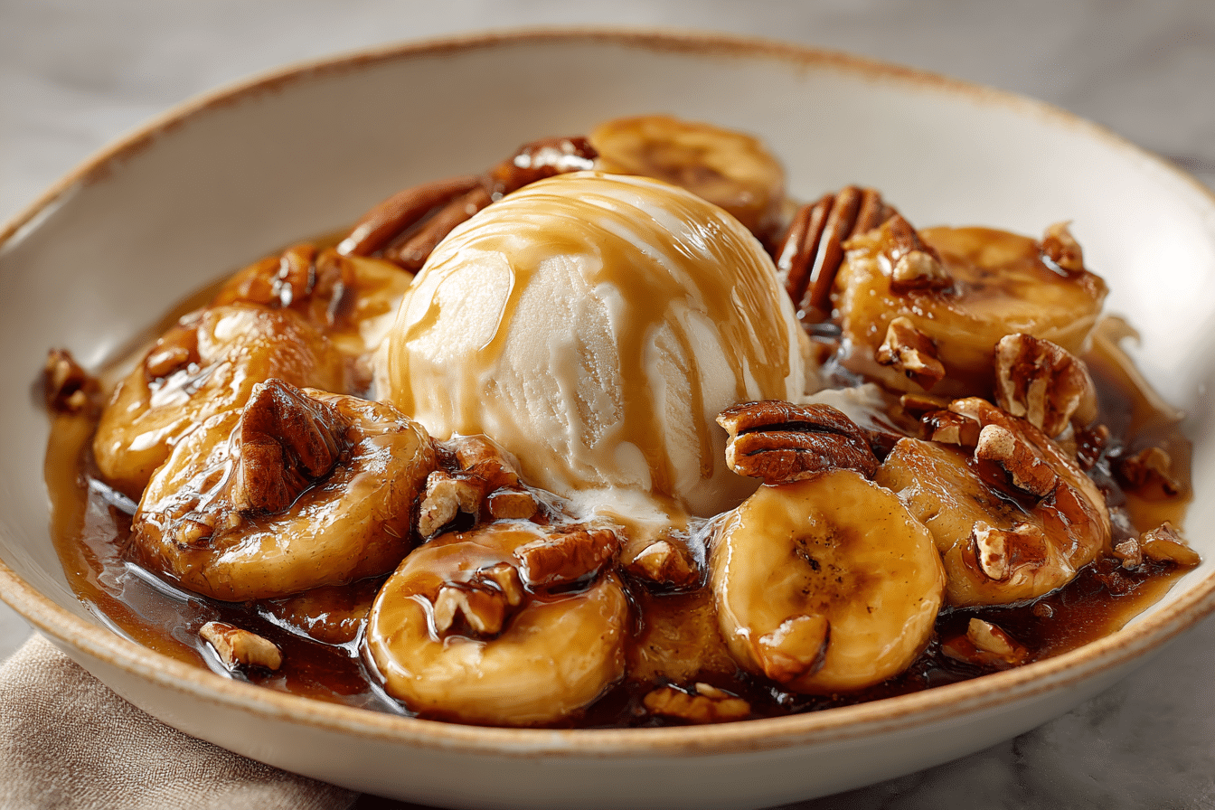 Banana Foster with Pecans & Caramel is a warm, nostalgic dessert that fills the kitchen with buttery sweetness and irresistible aroma. This Southern-inspired classic takes ripe bananas and transforms them into a silky, golden treat glazed in rich caramel sauce and crunchy toasted pecans. Every bite is pure comfort—soft, sweet banana mingling with deep, nutty flavors and a luxurious caramel glaze.