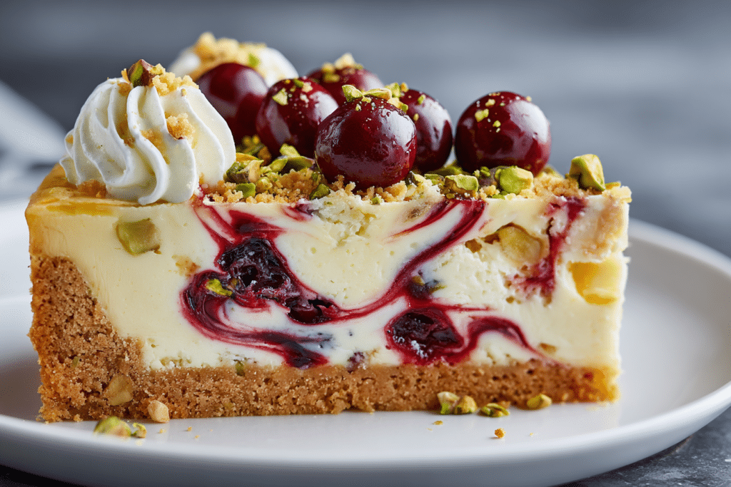 Cherry Pistachio Cheesecake is a stunning dessert that brings together creamy richness, nutty depth, and bright bursts of fruit in every slice. The smooth cheesecake filling rests on a buttery …