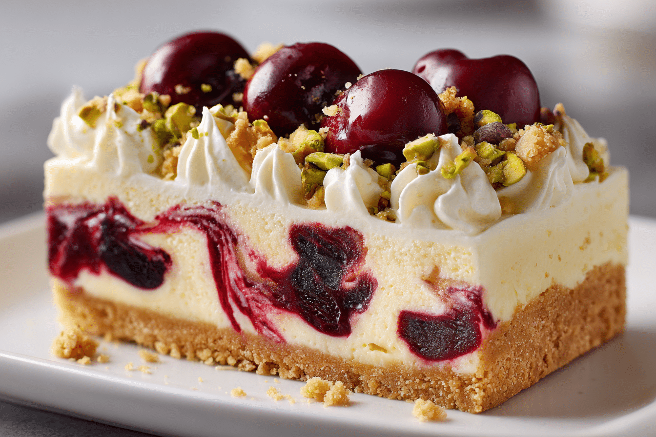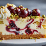 Cherry Pistachio Cheesecake is a stunning dessert that brings together creamy richness, nutty depth, and bright bursts of fruit in every slice. The smooth cheesecake filling rests on a buttery crust, layered with subtle pistachio flavor and crowned with glossy cherries that add color and balance.