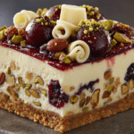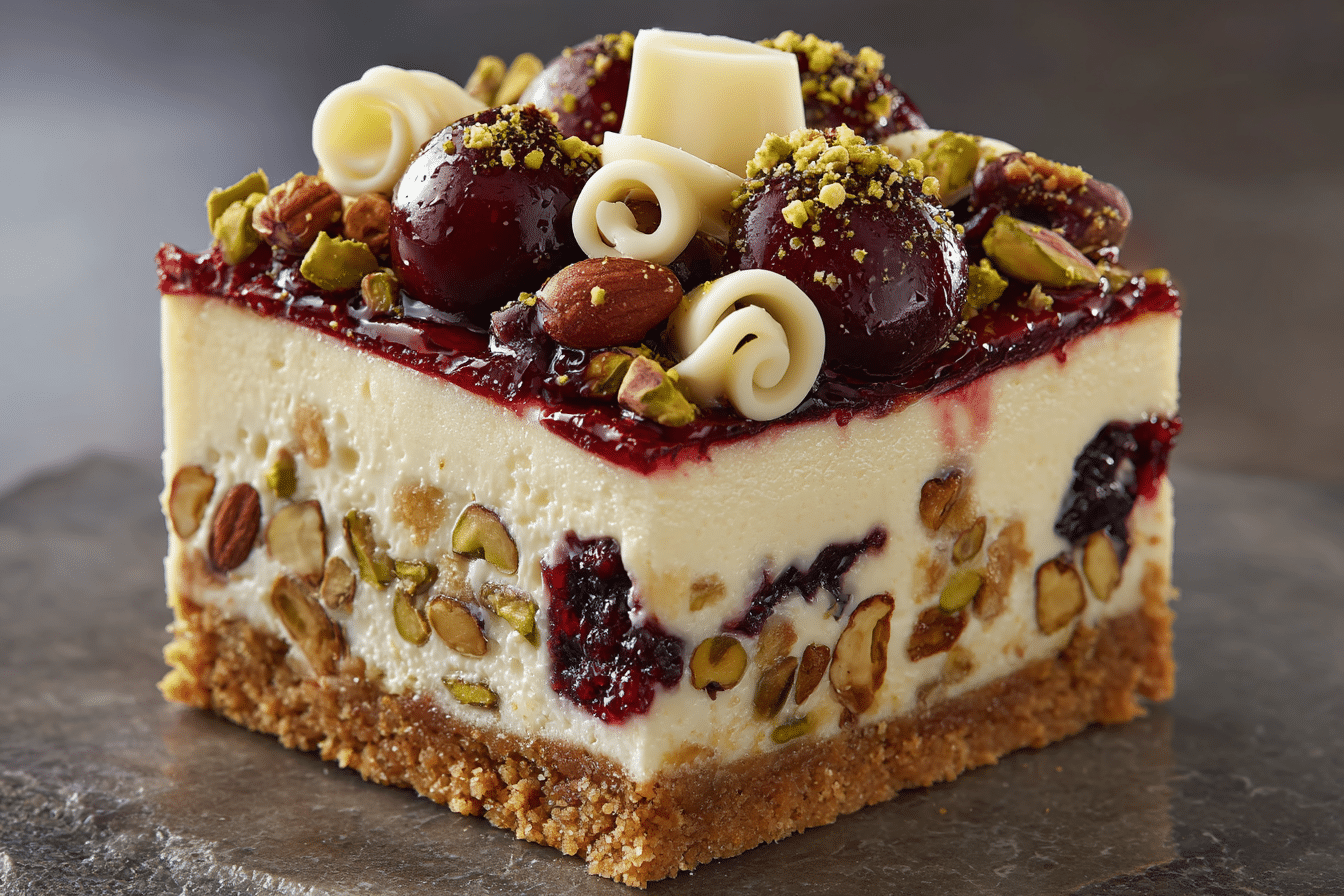 Cherry pistachio cheesecake is a luxurious dessert that pairs the rich, creamy texture of classic cheesecake with the sweet-tart burst of cherries and the earthy crunch of pistachios. With its vibrant color contrast, silky filling, and nutty base, this cheesecake is an eye-catching centerpiece perfect for any celebration or special occasion.