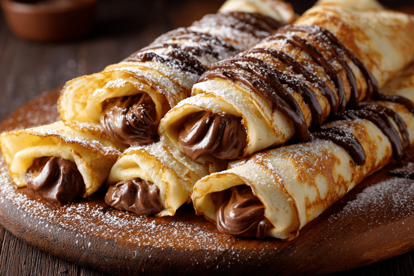Thin, tender crêpes filled with warm, melted chocolate and rolled into perfect handheld treats. A delightful dessert or brunch favorite.