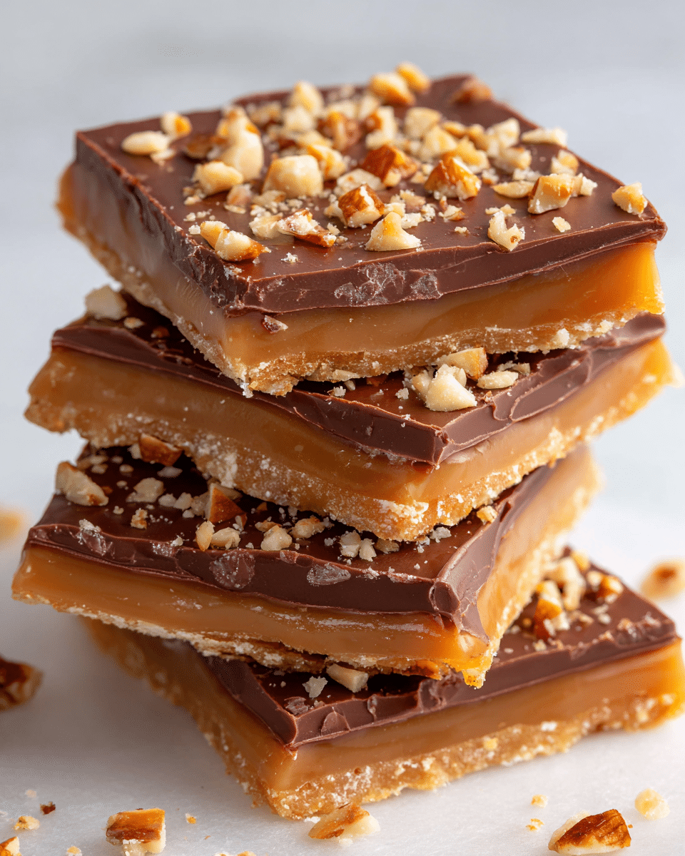 This buttery, crunchy toffee is topped with melted chocolate and nuts—easy to make, impossible to resist, and perfect for gifting or holiday trays.
