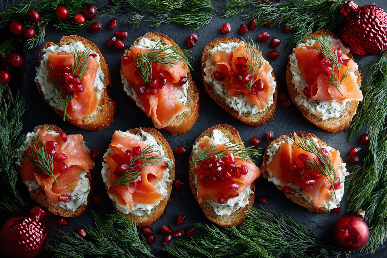 Inspired by classic Italian bruschetta and Nordic smoked salmon traditions, this holiday wreath combines crispy toasted bread with a creamy herbed base, topped with silky smoked salmon, capers, and fresh garnishes — all arranged in a beautiful wreath shape that doubles as edible decor.