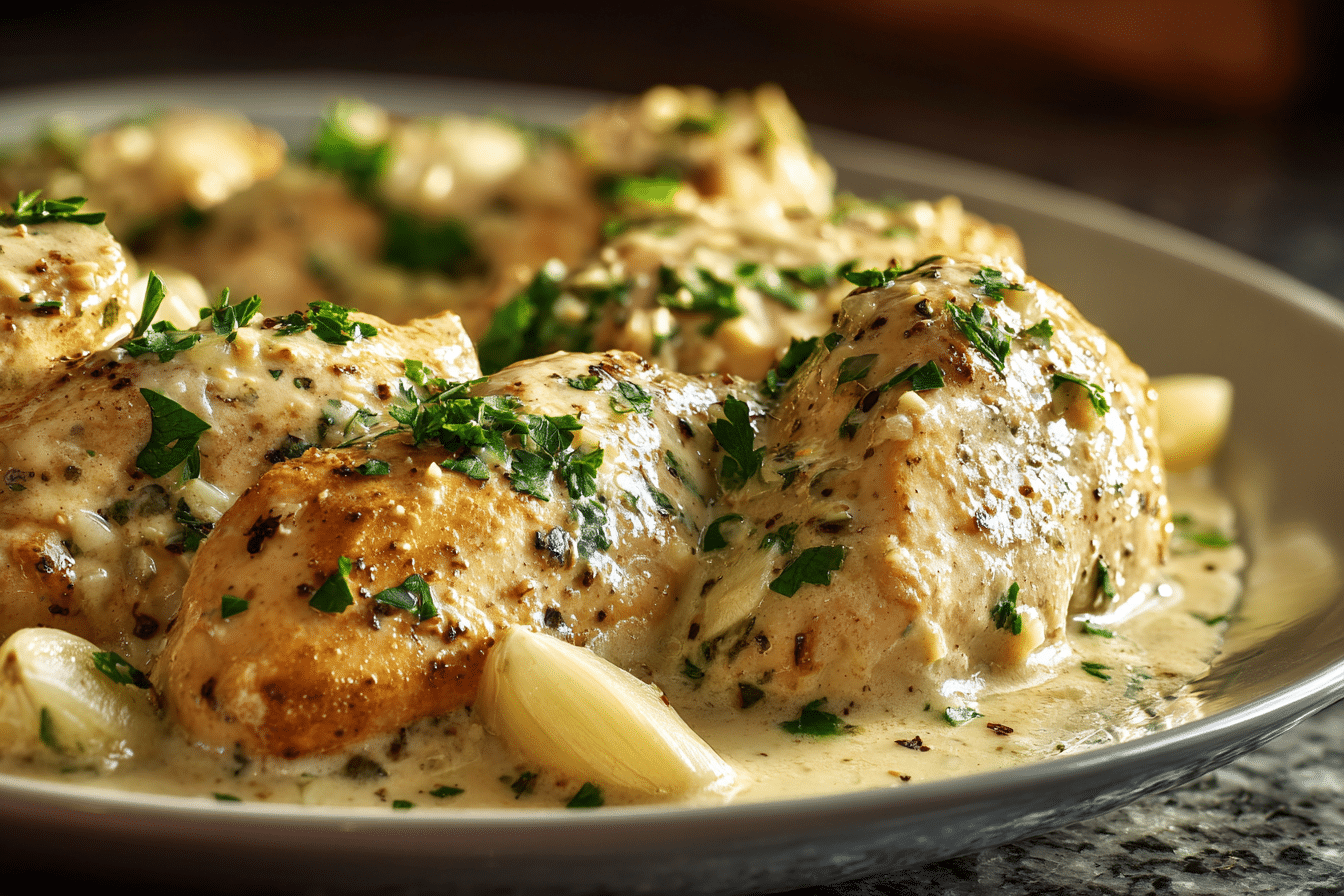 Creamy Garlic Chicken is a rich dish featuring tender chicken simmered in a smooth garlic cream sauce.