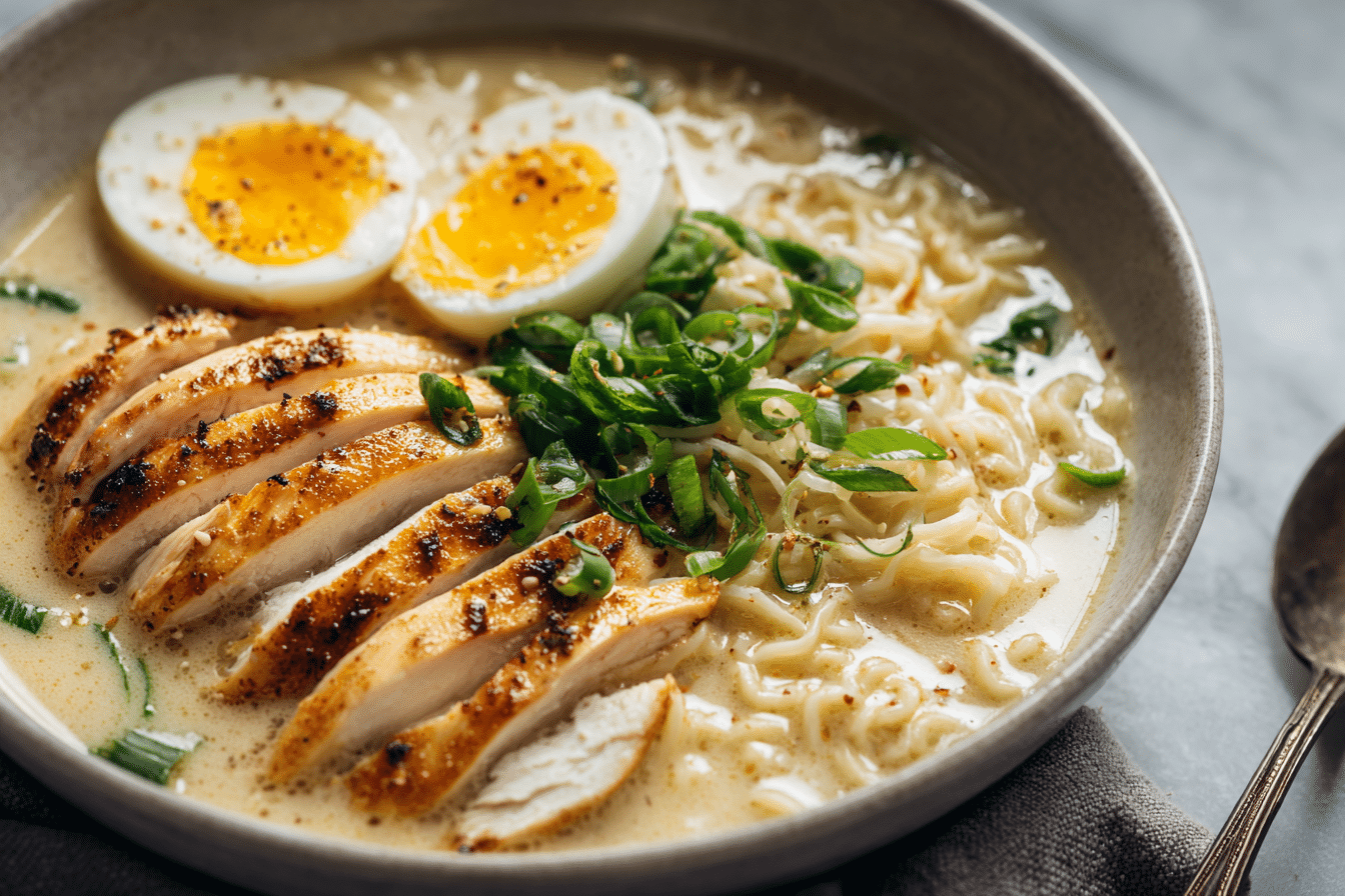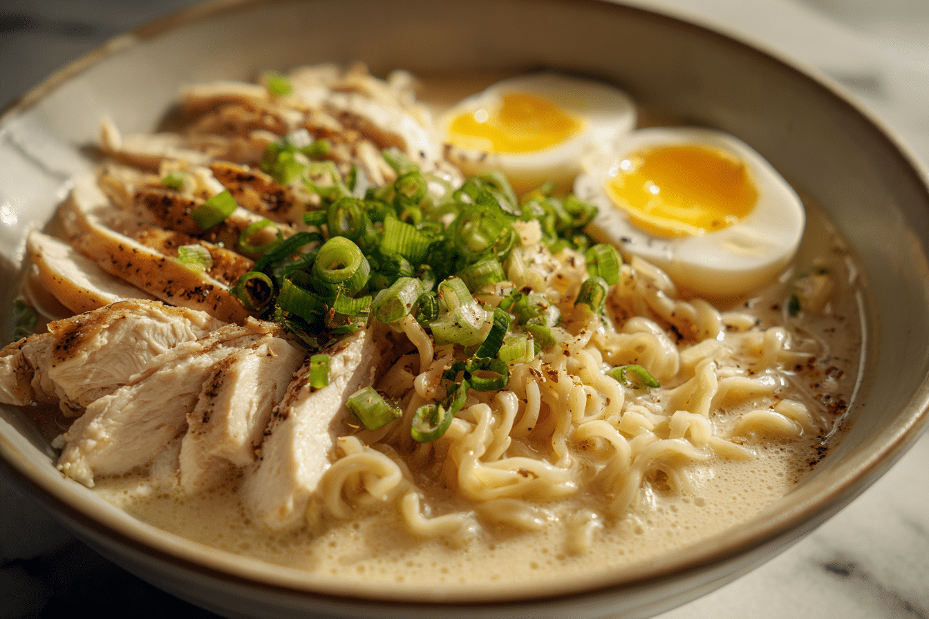 The base of Creamy Garlic Chicken Ramen begins with chicken, which provides both protein and flavor. Boneless, skinless chicken thighs are ideal because they remain juicy during cooking, though chicken breast can also be used for a leaner option.