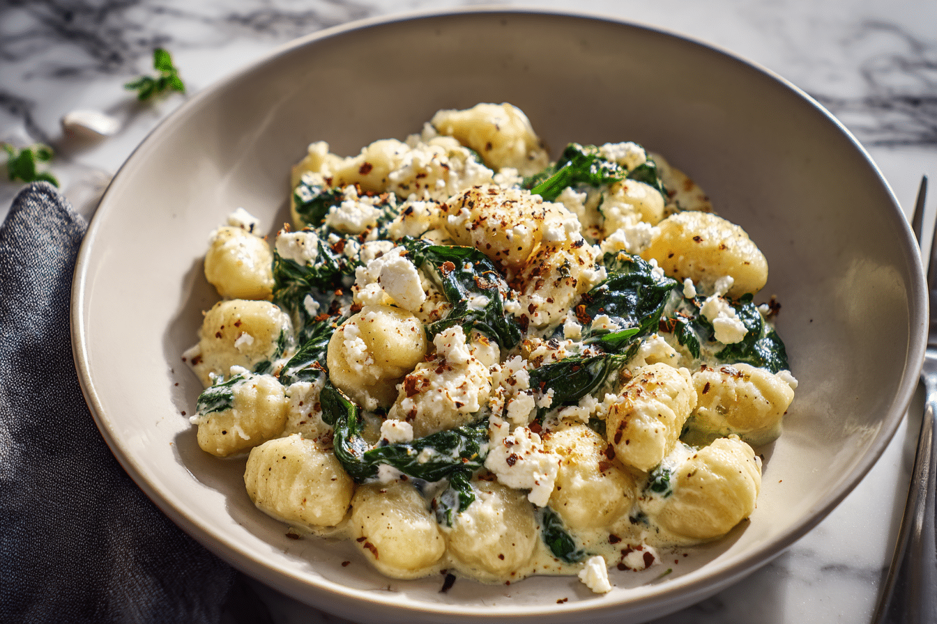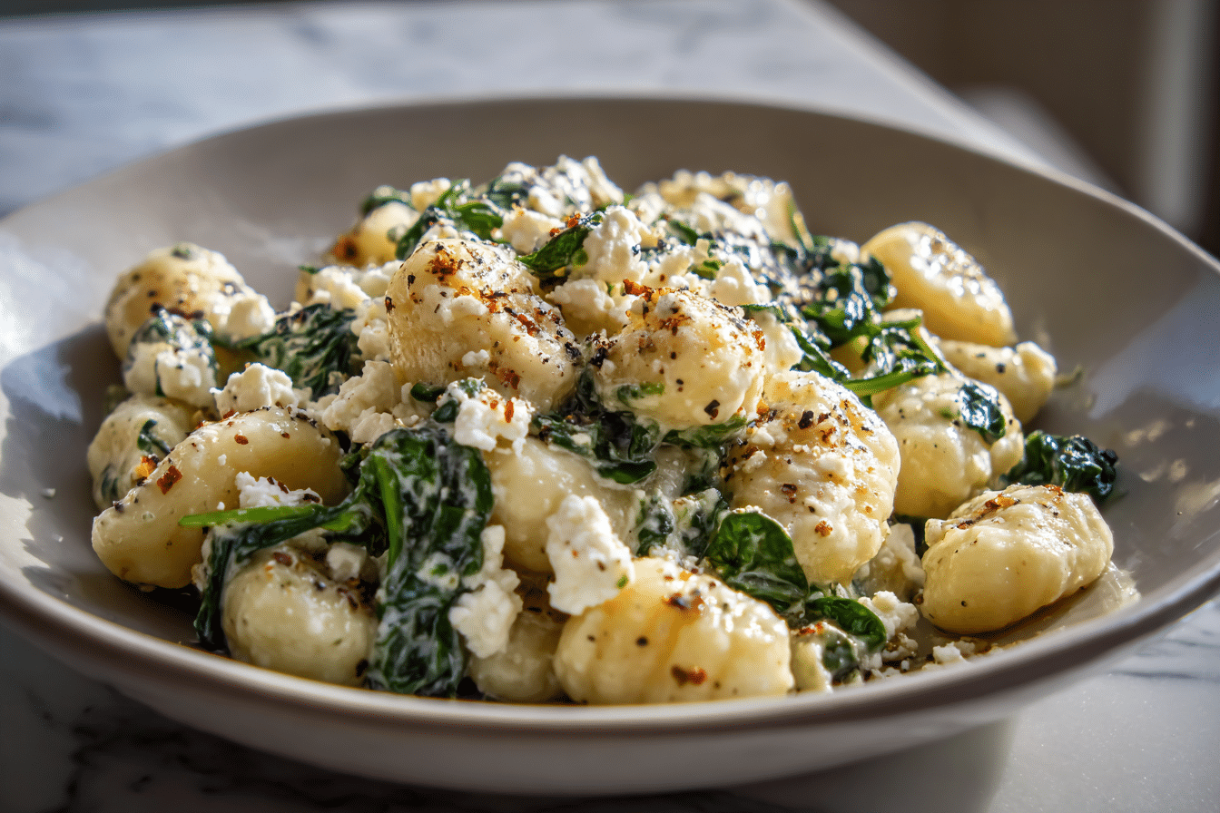 Creamy Gnocchi with Spinach and Feta is a rich and comforting dish featuring soft gnocchi tossed in a velvety cream sauce with wilted spinach and tangy feta cheese.