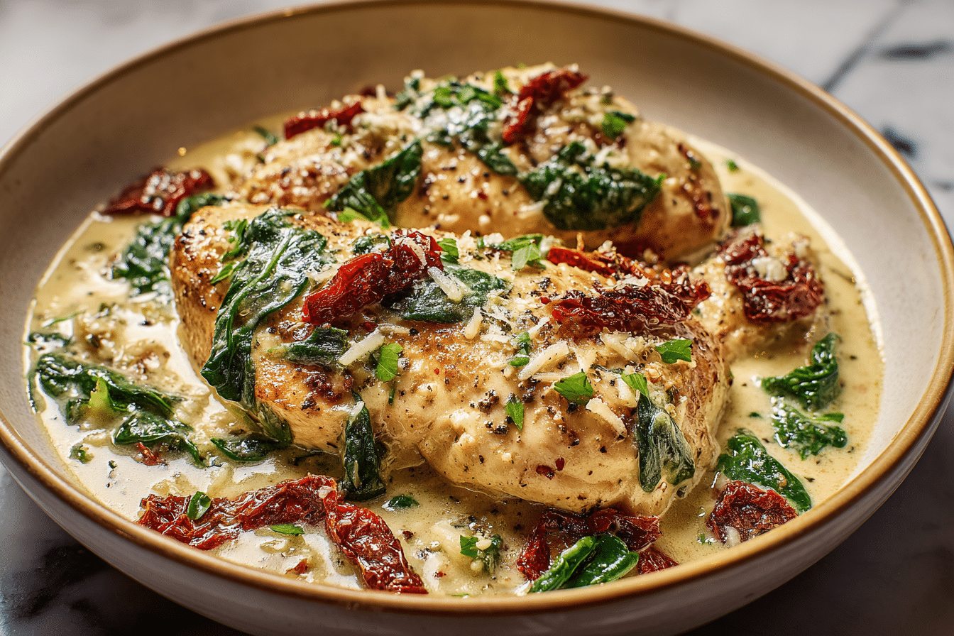 A slow cooker chicken dish in a creamy garlic and sun-dried tomato sauce, rich and tender, perfect for serving over pasta or rice.