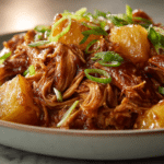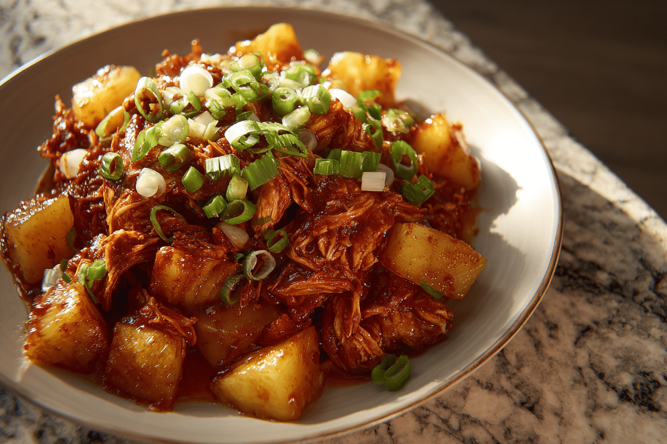 A slow-cooked chicken dish with sweet pineapple and rich barbecue sauce, resulting in tender, flavorful shredded chicken.