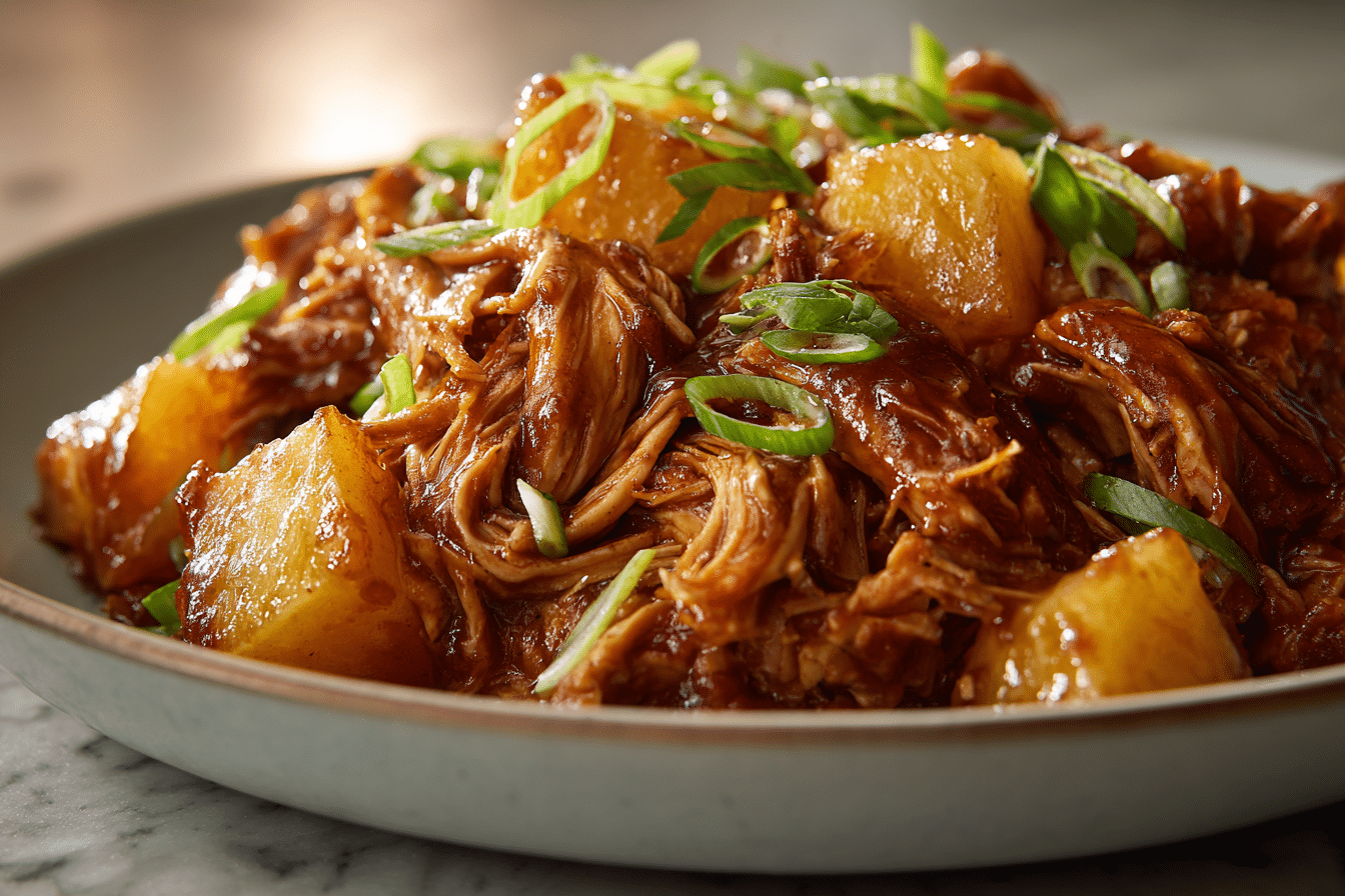 A slow-cooked chicken dish with sweet pineapple and rich barbecue sauce, resulting in tender, flavorful shredded chicken.