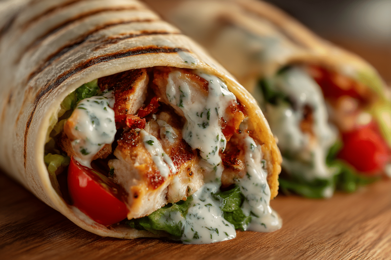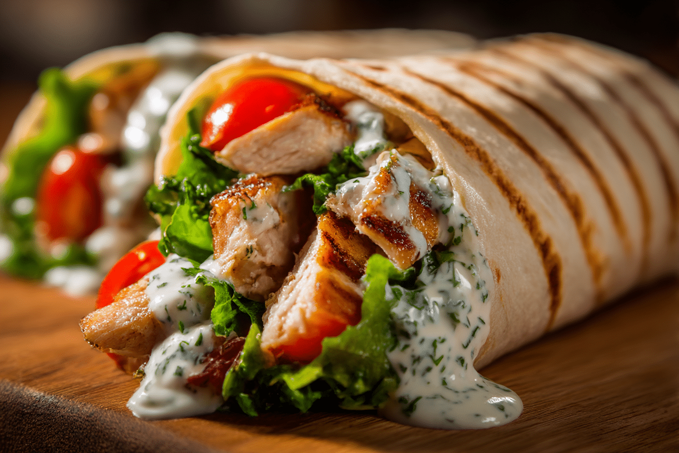 Juicy Mediterranean-marinated chicken wrapped in warm pita with fresh vegetables and creamy feta tzatziki for a healthy Greek-inspired dinner.