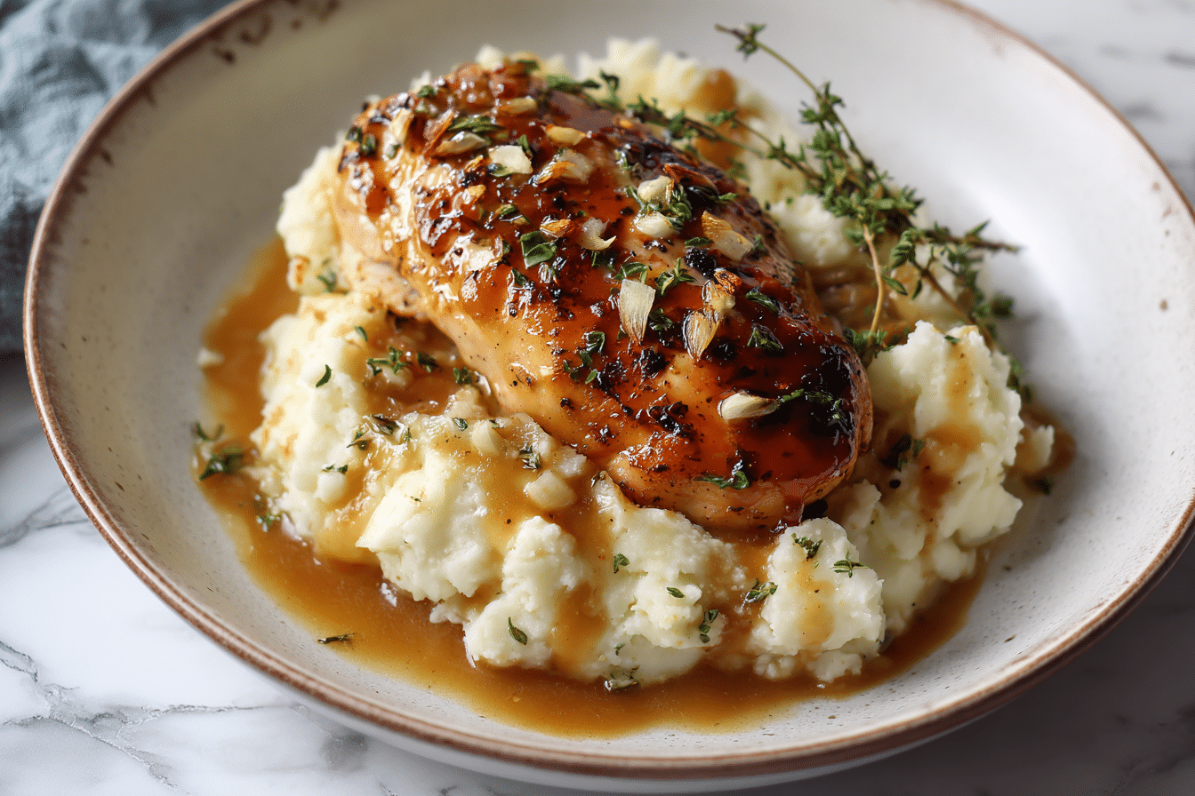 Glazed Garlic Herb Chicken Breast Over Creamy Mashed Potatoes with Pan Sauce is well-suited for family dinners, weekend meals, or small gatherings. It presents beautifully while remaining simple to prepare.