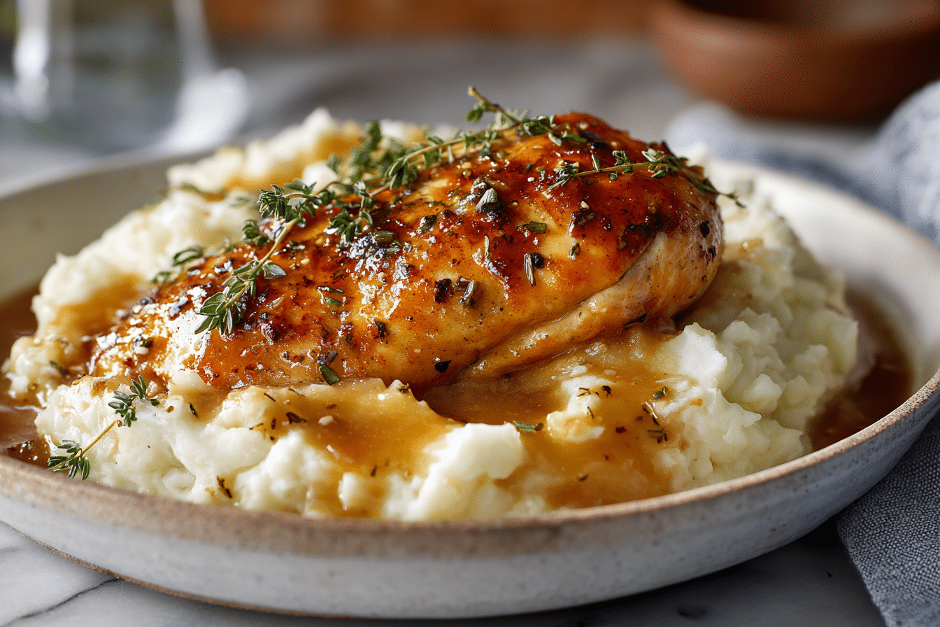 Glazed Garlic Herb Chicken Breast Over Creamy Mashed Potatoes with Pan Sauce is well-suited for family dinners, weekend meals, or small gatherings. It presents beautifully while remaining simple to prepare.