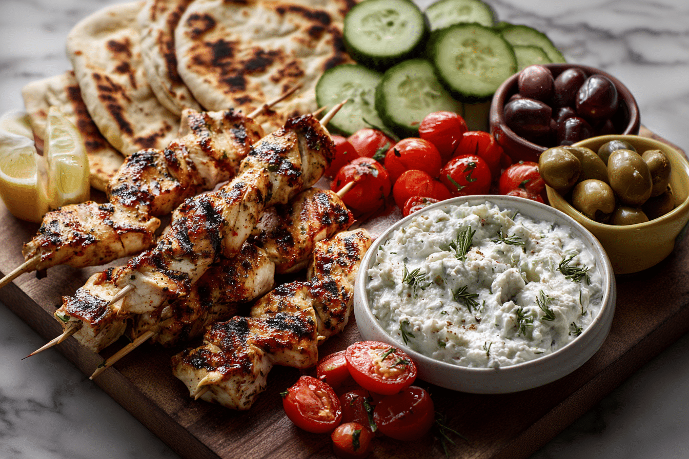 A Mediterranean-style grazing board with grilled chicken souvlaki, fresh vegetables, warm pita, and creamy feta dip.
