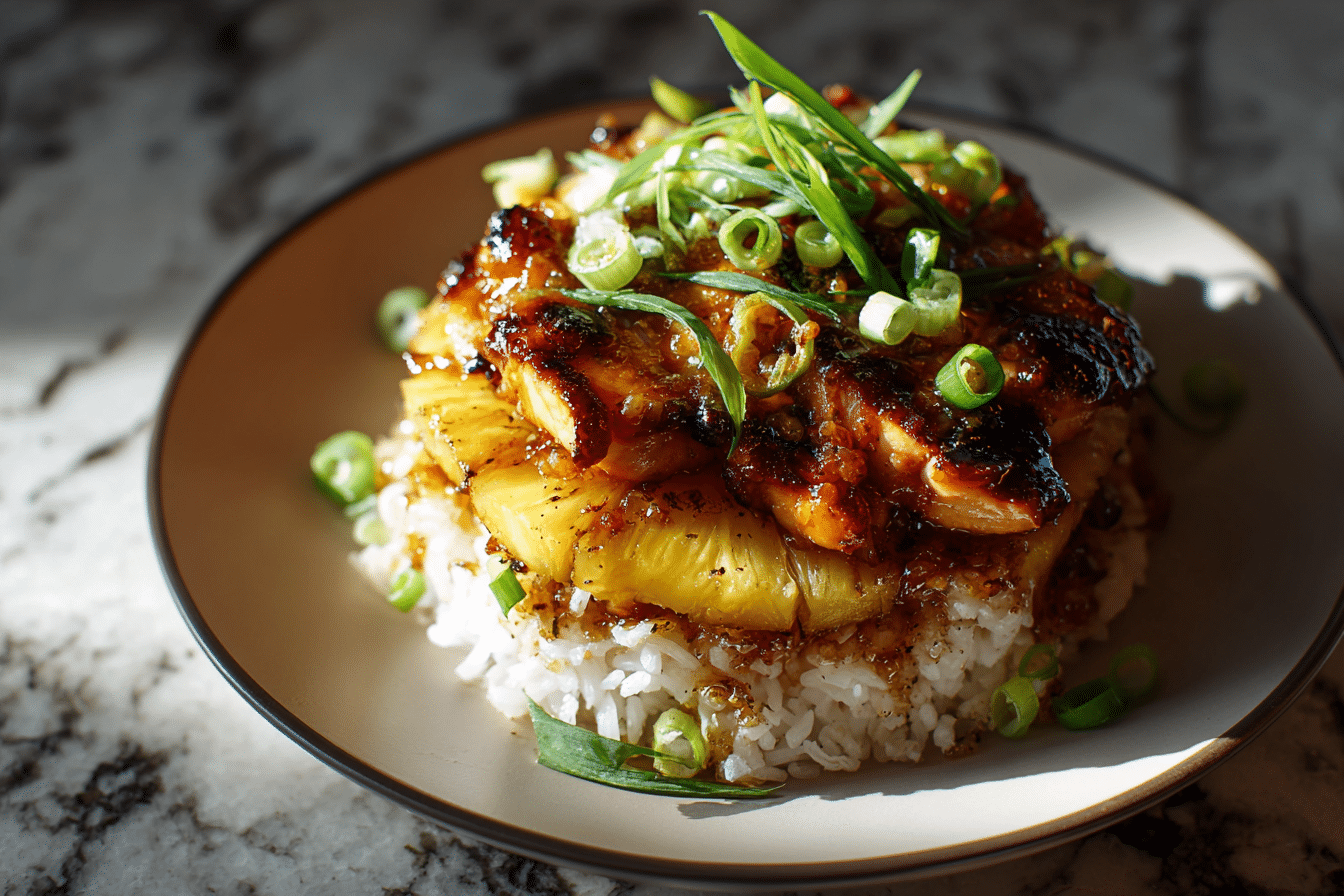 A layered dish of grilled Huli Huli chicken, caramelized pineapple, and rice with a sweet-savory glaze.