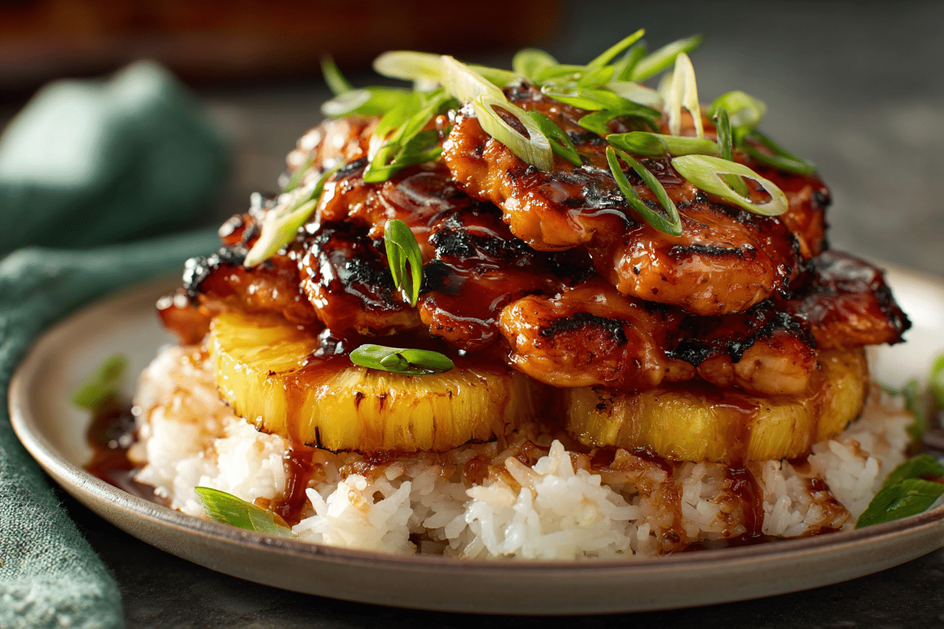 A layered dish of grilled Huli Huli chicken, caramelized pineapple, and rice with a sweet-savory glaze.