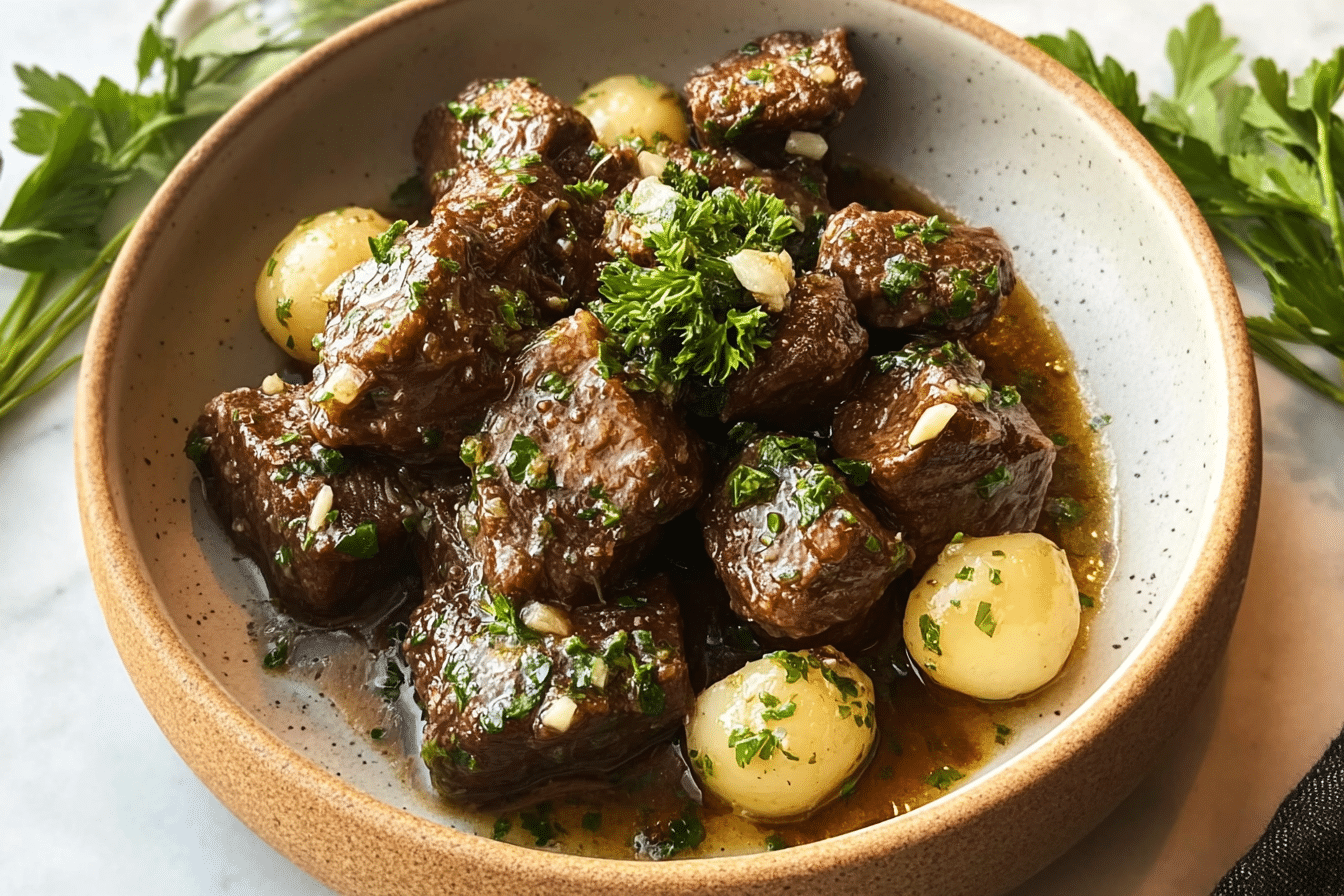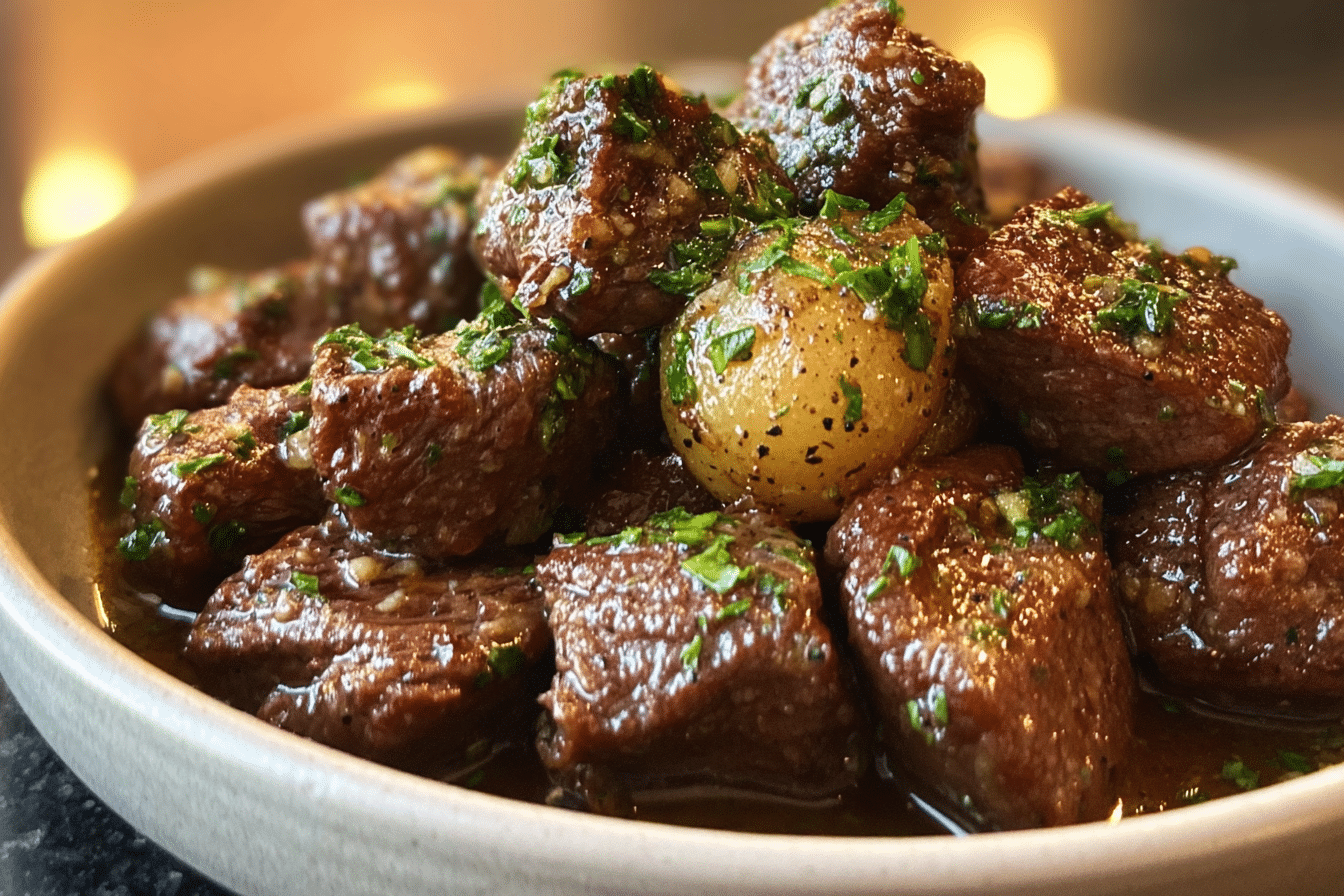 Tender, slow-cooked beef bites coated in a rich garlic butter sauce, packed with protein and deep savory flavor.