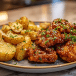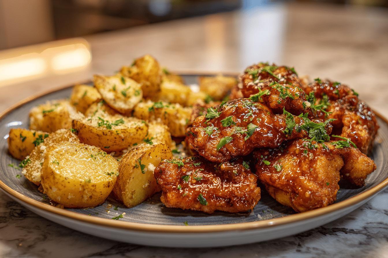 Honey BBQ Chicken & Garlic Parmesan Potatoes is a hearty, flavor-packed dish that brings together sweet, smoky chicken with crispy, savory potatoes. The rich glaze on the chicken pairs beautifully with the golden roasted potatoes coated in garlic and Parmesan, creating a balanced and satisfying meal.