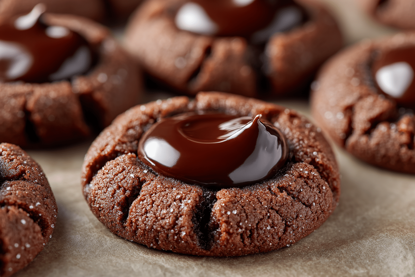 These Chocolate Thumbprint Cookies are a rich, indulgent take on the classic holiday treat, inspired by the elegant style of In Bloom Bakery. With a deep cocoa shortbread base and a luscious chocolate ganache center, these cookies are both beautiful and delicious — perfect for cookie boxes, afternoon tea, or simply treating yourself.
