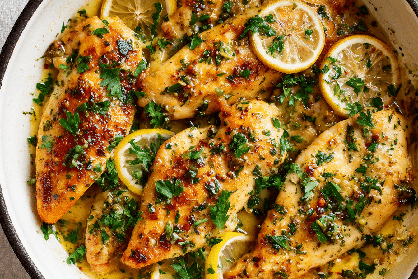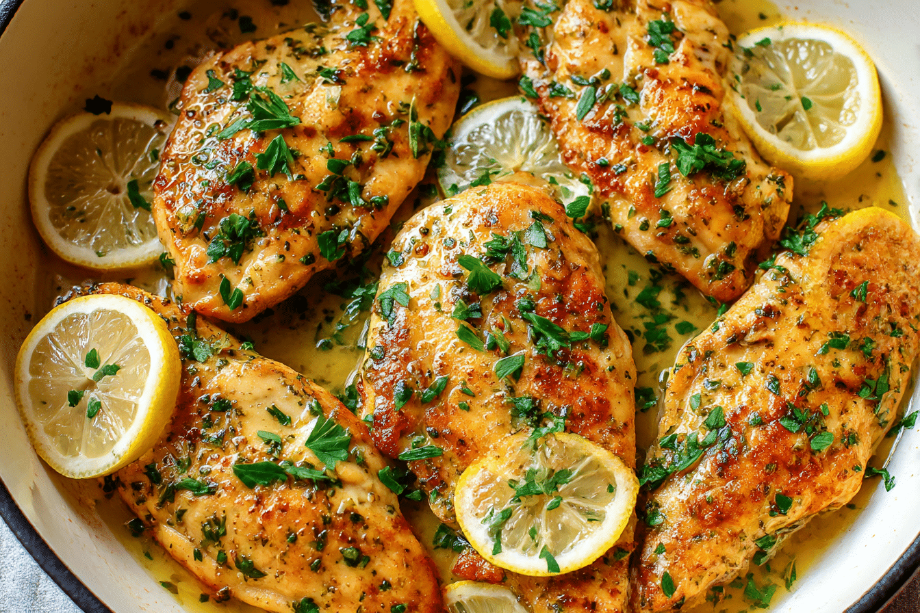 Juicy chicken breasts cooked to golden perfection and served with a rich, tangy lemon butter sauce.