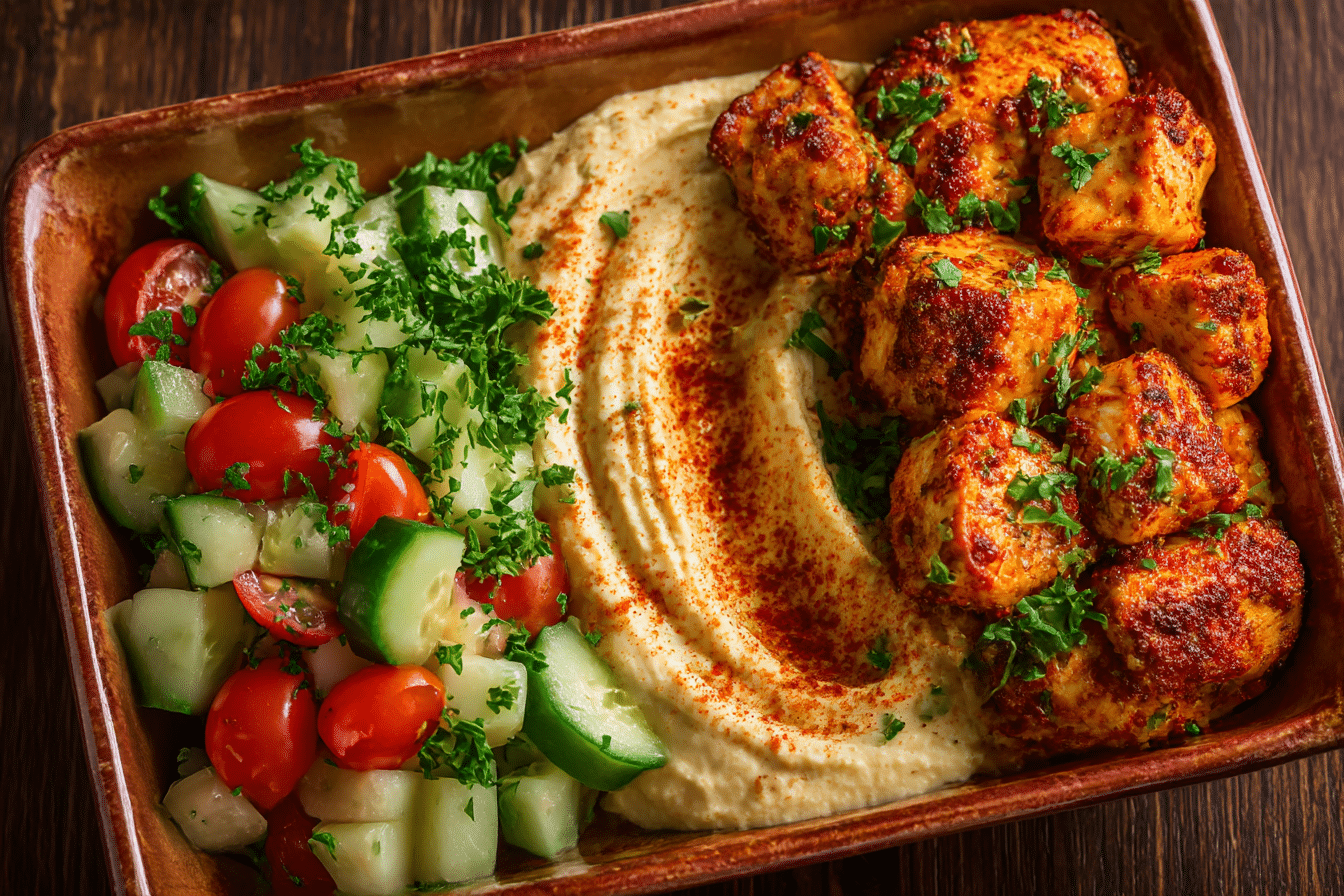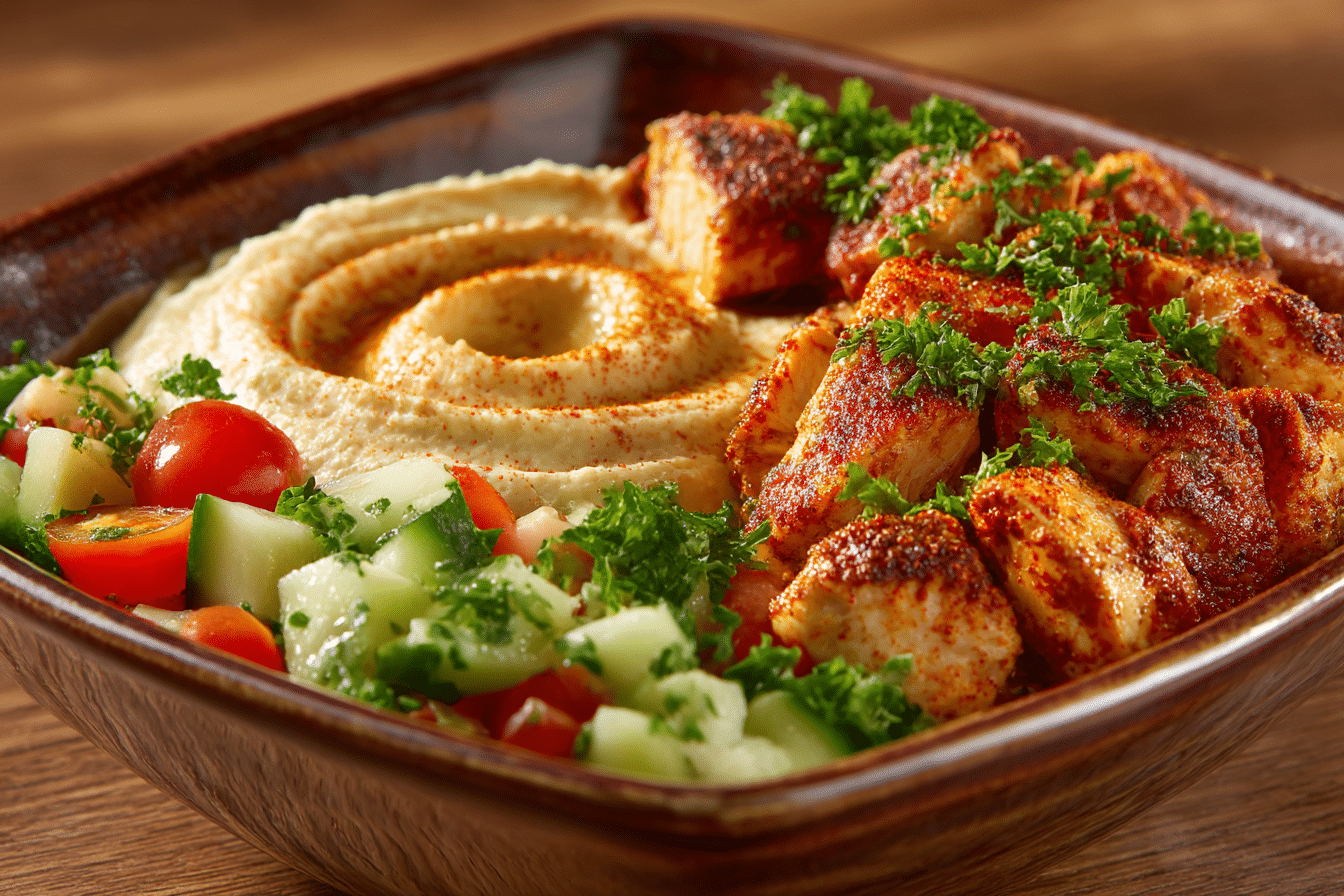 Substitutions are straightforward. Chicken thighs can be swapped for boneless, skinless chicken breasts or even firm tofu for a plant-based option. For heat variation, adjust chili flakes or add smoked paprika. Rice can be replaced with cauliflower rice for a lighter, lower-carb option, and hummus can be switched with tzatziki or avocado mash. The synergy of citrus, spice, creamy hummus, and fresh vegetables ensures the bowl remains refreshing, colorful, and flavorful.