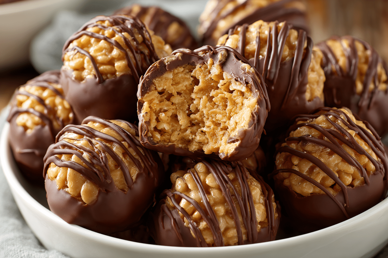 These 5-ingredient no-bake peanut butter Rice Krispie balls are chewy, crunchy, and dipped in chocolate — the perfect quick treat for holidays, parties, or everyday snacking.