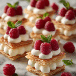Elegant but easy to make, these raspberry cream napoleons feature crisp puff pastry, creamy vanilla filling, and fresh raspberries in beautiful layered form.