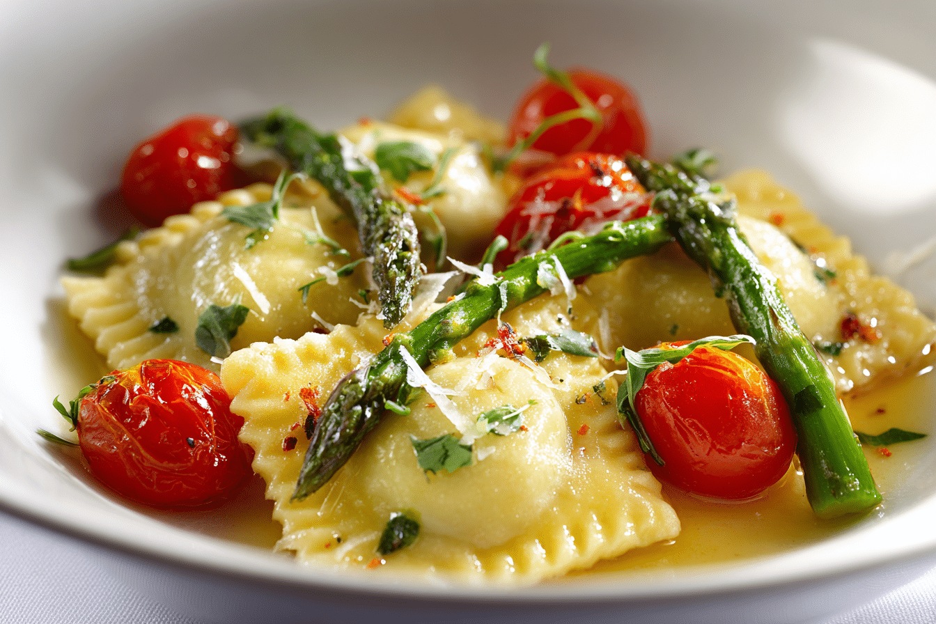 This dish offers a balance of carbohydrates from the ravioli and nutrients from fresh vegetables. Asparagus provides fiber and vitamins, while tomatoes contribute antioxidants and natural sweetness.