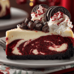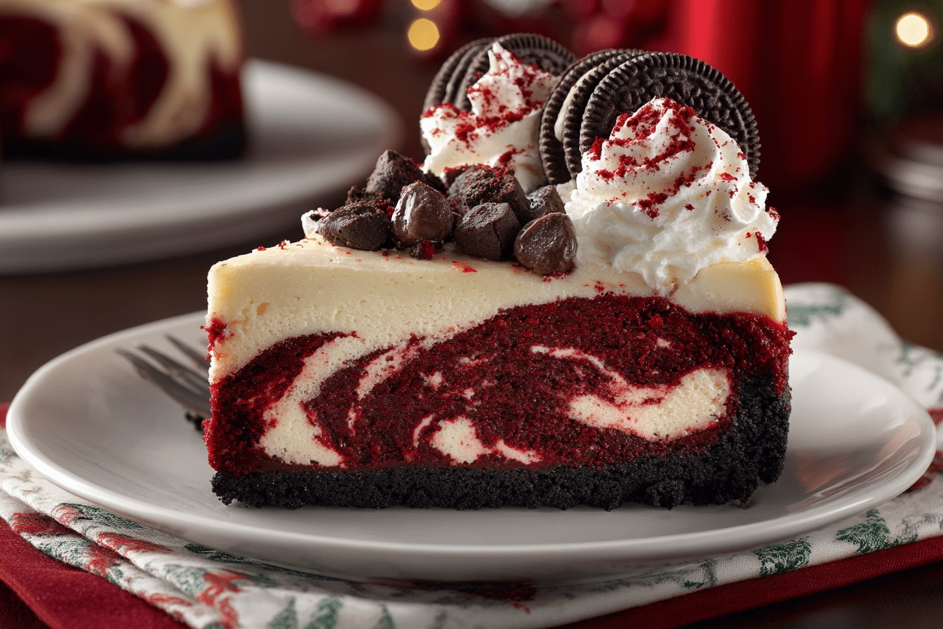 This Christmas red velvet cheesecake features a chocolate cookie crust, a smooth red velvet filling with hints of cocoa and vanilla, and festive whipped cream topping. Perfect for holiday tables and special occasions.