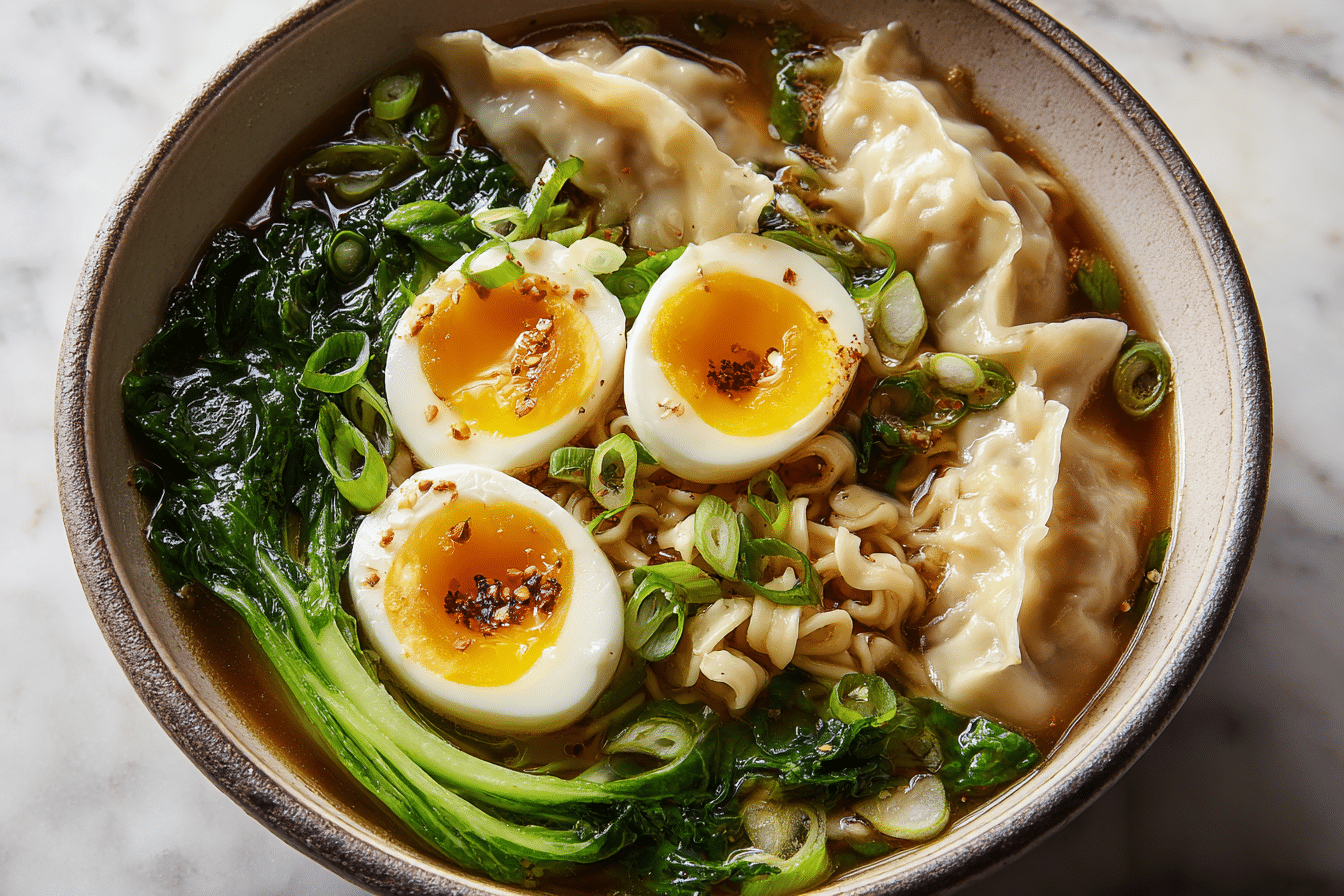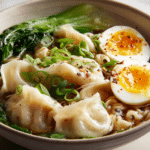 Savory Dumpling Ramen Bowl with Soft-Boiled Eggs and Fresh Greens is a deeply satisfying dish that combines tender dumplings, rich broth, and silky noodles in one warm, nourishing bowl. The addition of soft-boiled eggs and vibrant greens creates a balanced meal with layers of flavor and texture.