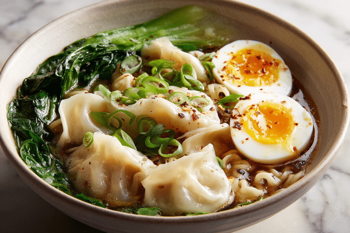 A comforting ramen bowl with savory dumplings, soft noodles, rich broth, and fresh greens.