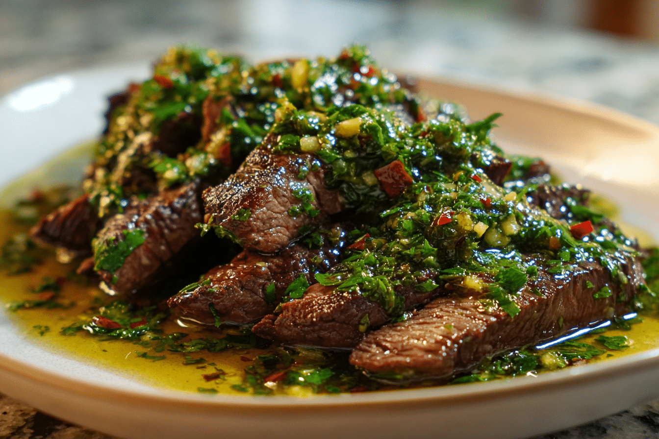 Skirt Steak Marinade with Chimichurri is a vibrant and satisfying dish that highlights the natural richness of beef with fresh, herb-forward flavor. The steak is marinated to deepen its savory profile, then cooked quickly over high heat to achieve a beautifully seared exterior and tender interior.