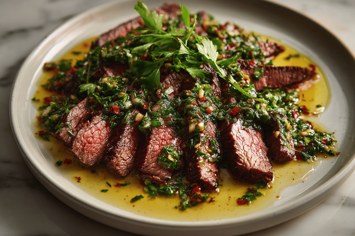 The chimichurri sauce adds a fresh and lively contrast, combining herbs, garlic, and acidity to cut through the richness of the steak. Together, they create a balanced dish that feels both hearty and refreshing, perfect for a variety of occasions.