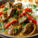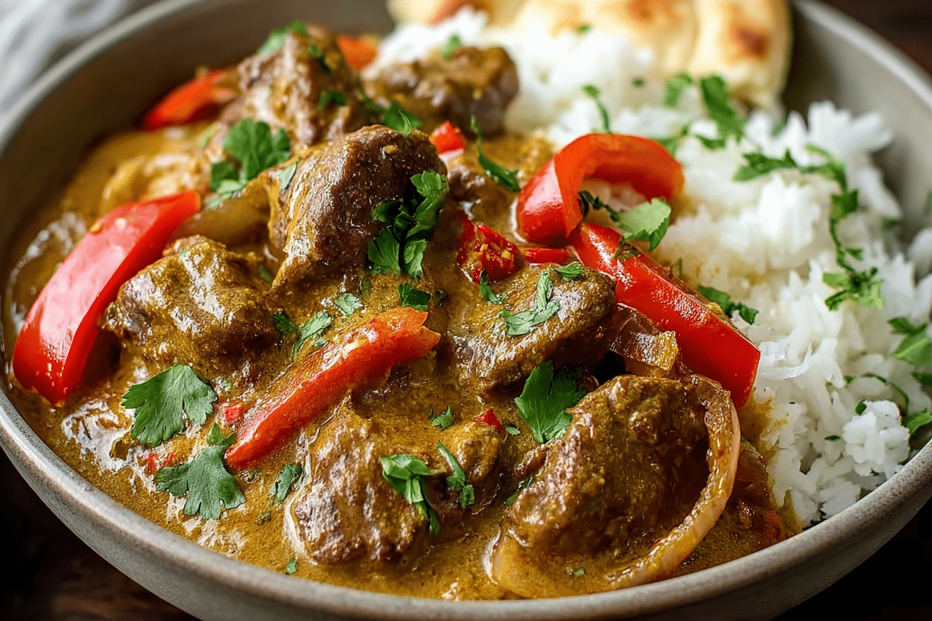 A slow-cooked beef curry made with coconut milk, warm spices, and tender chunks of beef in a rich, creamy sauce.