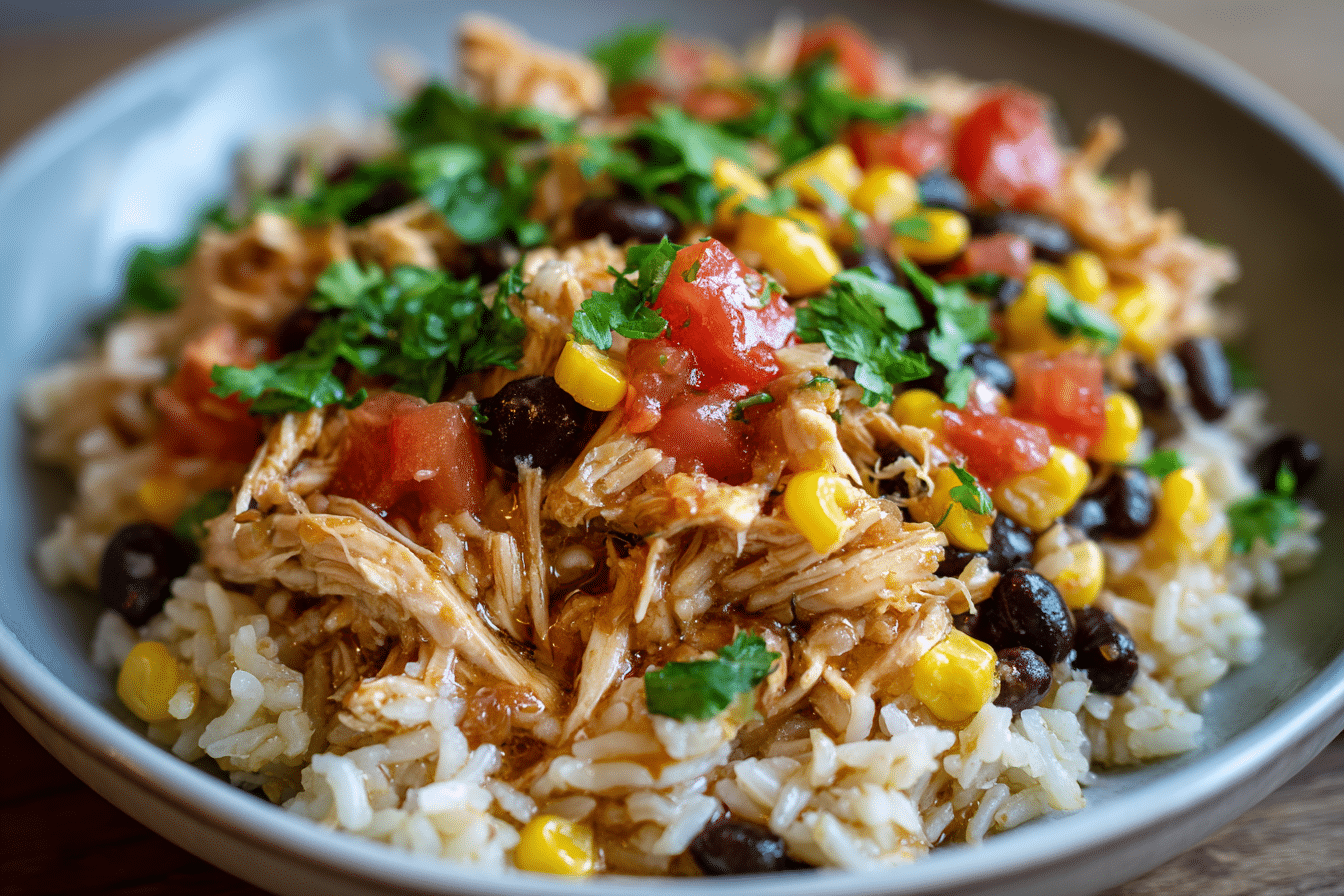 A hearty slow cooker chicken burrito bowl with tender shredded chicken, rice, beans, and bold spices.