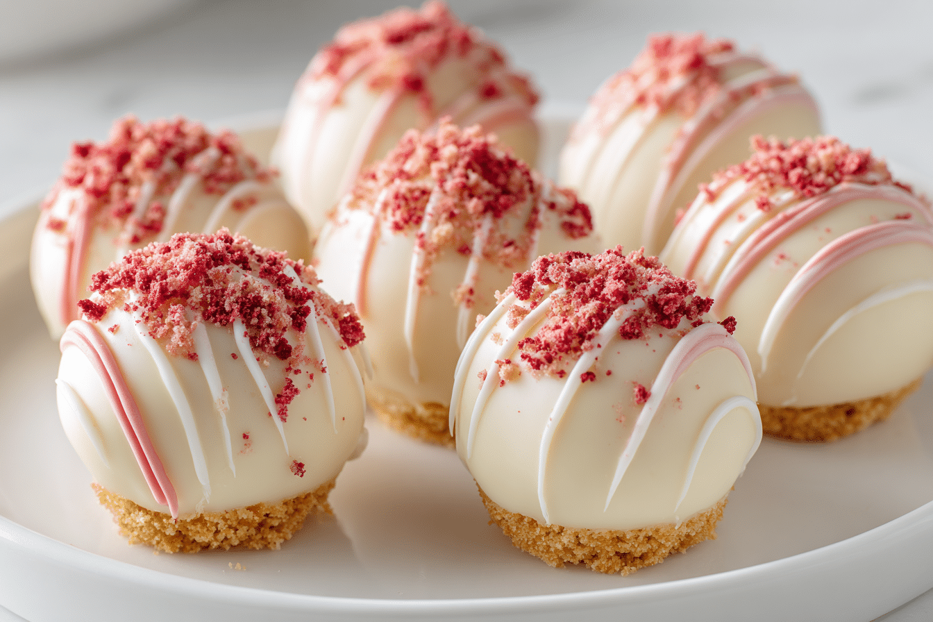 Strawberry cheesecake truffle balls suit many settings, from holiday dessert trays to afternoon coffee spreads. Their small size makes them ideal for sharing without plates or utensils.